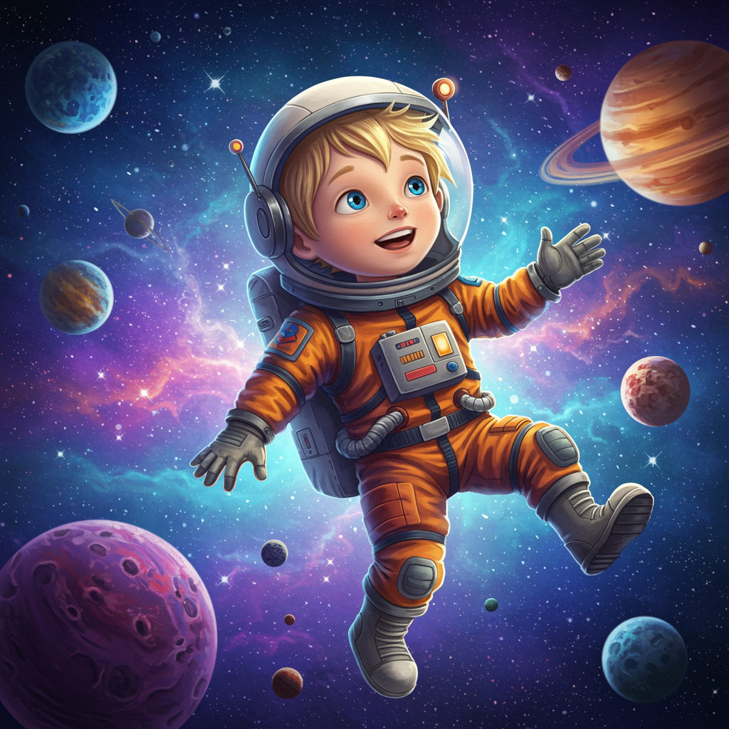 A young boy with blonde hair, dressed in a vibrant astronaut costume and helmet, floats amidst a dazzling space scene filled with vividly colored planets. The illustration blends the whimsical, cartoony style with the detailed elegance of Thomas Blackshear's work. The boy's expression is one of awe and wonder, captured in a lively, dynamic pose that suggests movement through the cosmos. The background features mesmerizing colorscapes, rich with deep blues, purples, and shimmering stars, reminiscent of the captivating artistry of Tim Okamura. The overall image is ultra-high definition, bringing to life this enchanting scene with stunning clarity and depth.