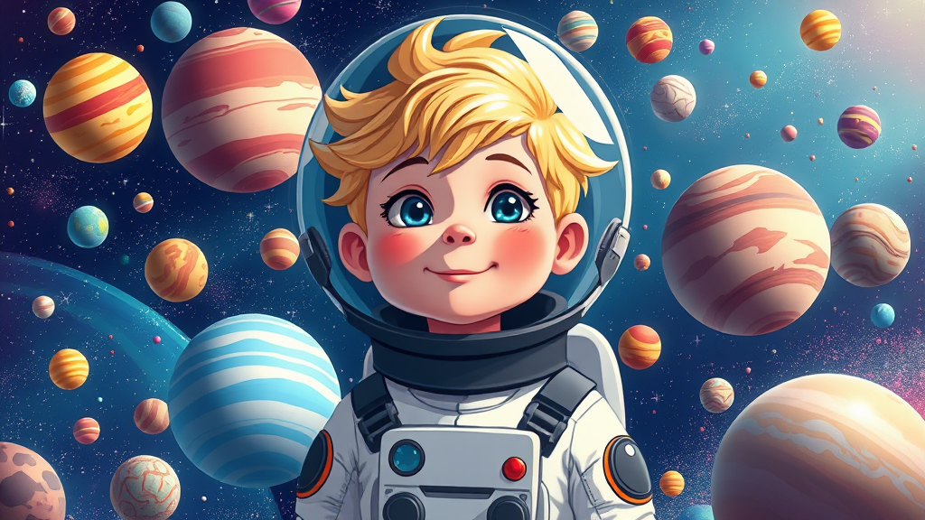 A young boy with blonde hair dressed in a whimsical astronaut costume and helmet, surrounded by a vibrant space scene filled with an array of colorful planets. The illustration features a blend of cartoony characters and a style reminiscent of Cyril Rolando and Thomas Blackshear, with mesmerizing colorscapes and lively elements. The background bursts with Tim Okamura-inspired details, creating a vivid and enchanting UHD image reflecting the wonder of space exploration.