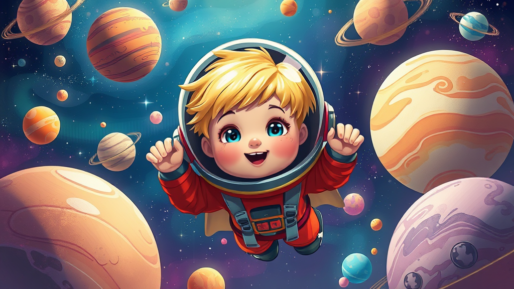 A young boy with blonde hair in a vibrant astronaut costume and helmet floats amidst a whimsical space filled with several planets, the scene painted in a style reminiscent of Cyril Rolando. The composition features lively, cartoony characters set against mesmerizing colorscapes. The illustration combines the emotional depth reminiscent of Thomas Blackshear with the striking visual style of Tim Okamura, culminating in a captivating UHD image that transports viewers to a lively cosmic adventure.