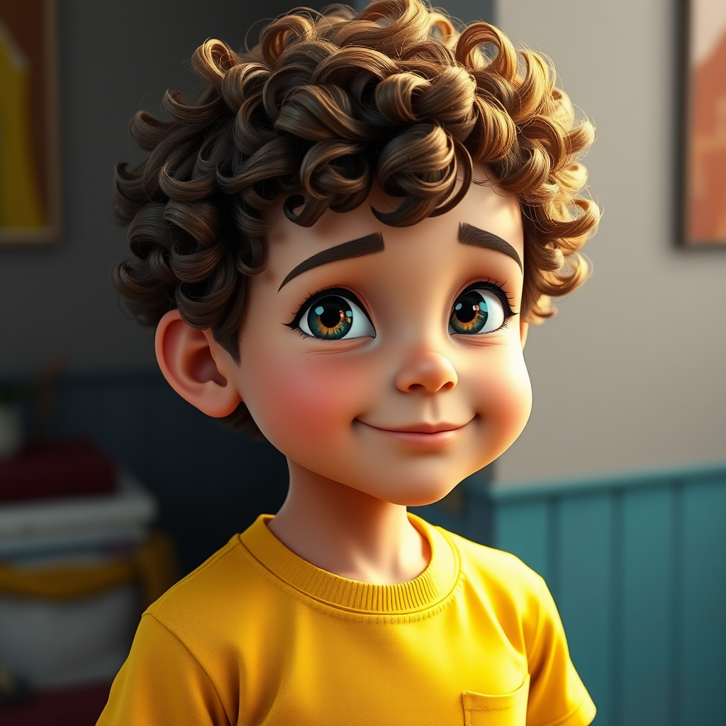 A young boy with curly hair and a bright yellow shirt, depicted in the captivating style of cinema4D rendering, exuding the charm of delightful characters; his beauty is astonishing, reminiscent of Rudolph Belarski's artwork. The image boasts intricate, blink-and-you-miss-it details with dramatic shading, presenting a playful and cartoonish caricature. The scene is set in an elongated vertical frame, allowing the viewer to appreciate the stylized artistry that enhances the visual narrative.