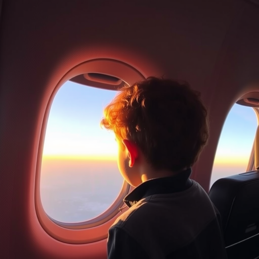 A young boy with curly, short red hair gazes out the airplane window, mesmerized by the scenery. From behind, his vibrant hair catches a warm glow, enhanced by the golden hues of the setting sun that paint the sky in rich amber tones. The atmosphere inside the cabin is calm and reflective as the child remains captivated by the changing colors of the horizon.