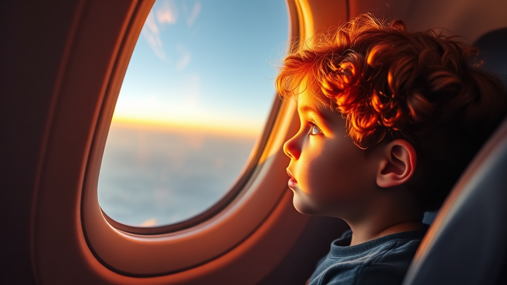A young boy with short, curly, and fiery red hair gazes out the airplane window, captivated by the enchanting view. The sky outside glows with a warm golden hue as the sun begins to set, casting a reddish tint over his curls. The scene captures the awe and wonder of travel, as the child is mesmerized by the changing colors of the horizon.