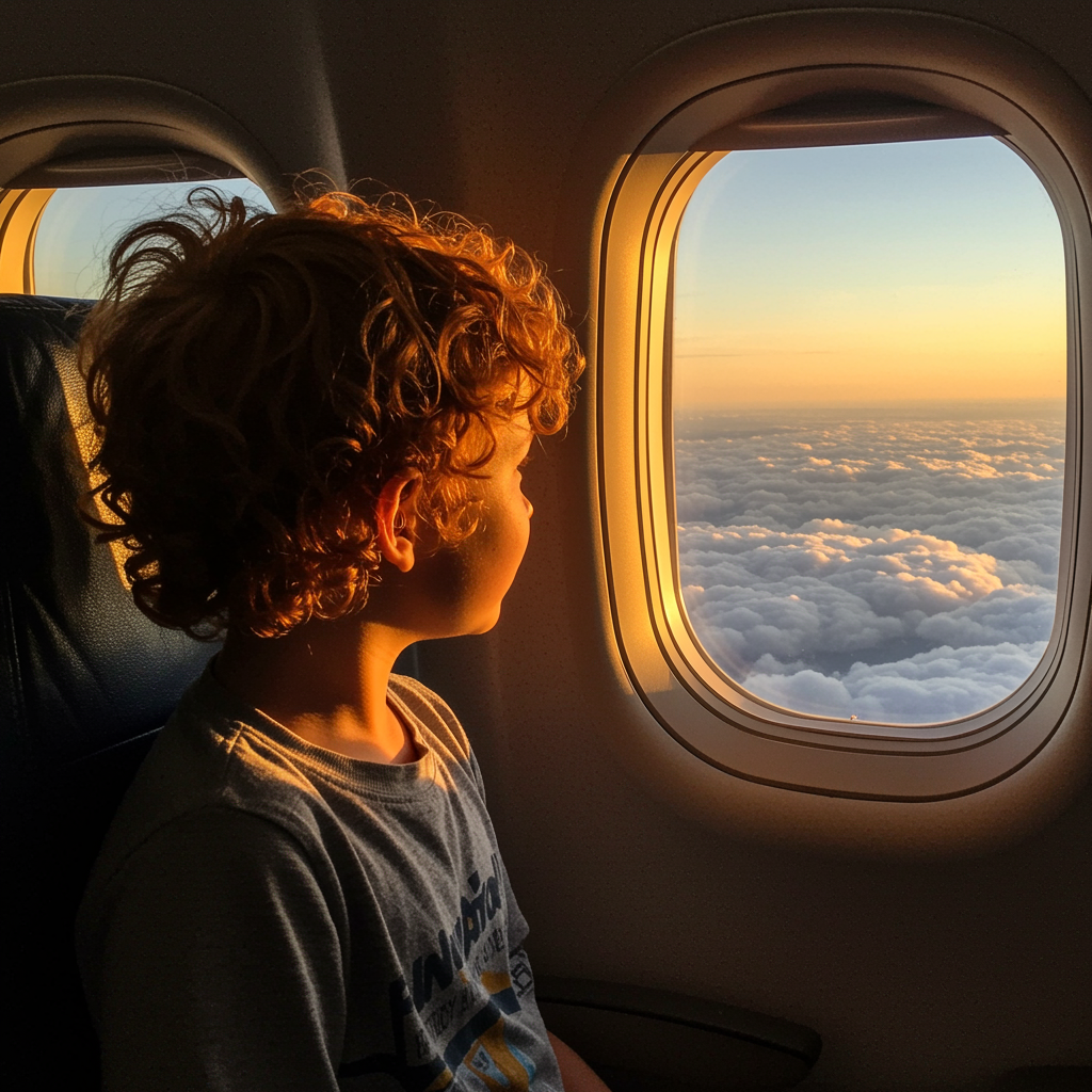 A young boy with short, curly, red hair gazes out of the airplane window, absorbing the breathtaking view. The setting sun casts a golden hue across the sky, intensifying the fiery tones in his hair. Shadows dance on the seat beside him as he remains captivated by the panoramic vista unfolding beyond the glass, where clouds bathe in the warm glow of the evening light.