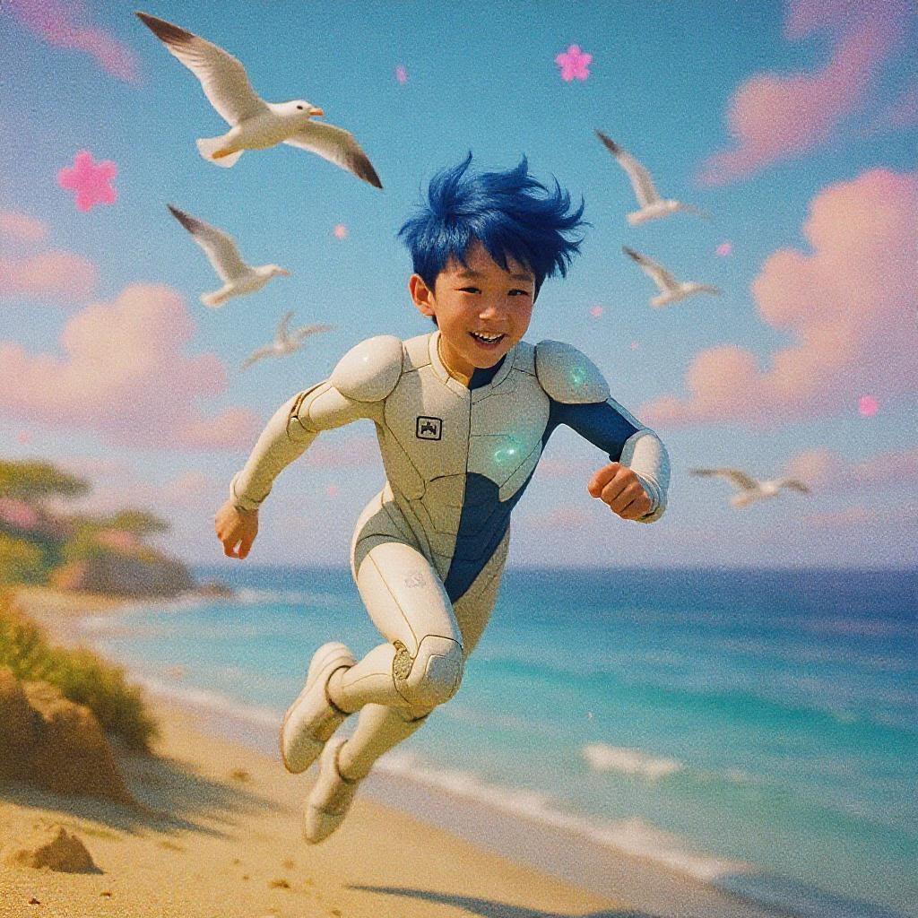 A young boy with striking blue hair, donning a state-of-the-art suit that dynamically shifts its appearance, dashes along a digital coastline as AI-controlled seagulls flutter overhead. The scene is reminiscent of Rinko Kawauchi's style, with naturalistic poses and an ambiance of vacation dadcore. The boy exudes youthful exuberance and a cool demeanor, set against a backdrop of cyberpunk aesthetics. The sky is adorned with technicolor flowers, captured in dreamy lo-fi photography. The setting is vibrant, encapsulated in super-detailed analog film, rendering the moment in a surreal yet familiar light. Captured on a Fujifilm XT4, the image conveys a colorful, raw style with an aspect ratio of 3:4 and a saturation that breathes life into the digital landscape, creating a harmonious blend of futuristic and nostalgic elements.