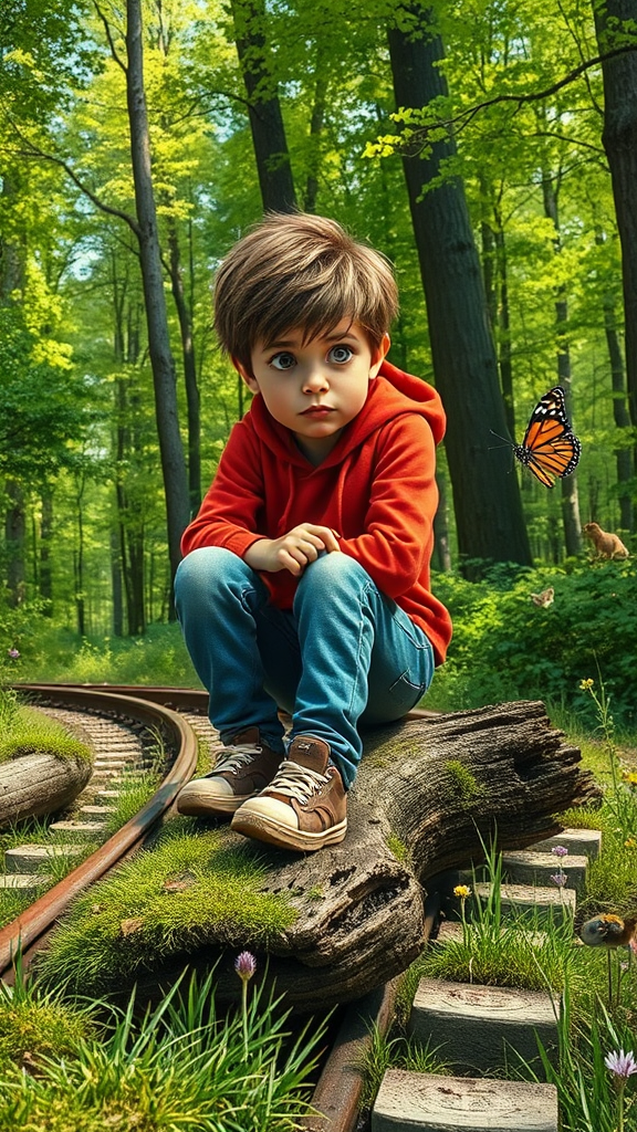 A young boy with tousled brown hair and big, sorrowful eyes sits slouched on a moss-covered, rotten wooden log beside a rusty train track. He wears a bright red hoodie and faded blue jeans, his sneakers scuffed and muddy. Surrounding him is a lush, vibrant green forest, with tall trees gently swaying in the breeze, their leaves a symphony of different shades of green. Sunlight filters through the branches, casting dappled patterns on the forest floor. Small woodland critters curiously peek out from behind the foliage, adding a touch of liveliness to the scene. A colorful butterfly flutters nearby, momentarily catching the boy's attention, bringing a faint smile to his otherwise sad expression. Wildflowers of various colors dot the landscape, contrasting with the somber mood. Despite the boy's sadness, the forest around him seems alive and vibrant, providing a whimsical backdrop to his emotional moment.