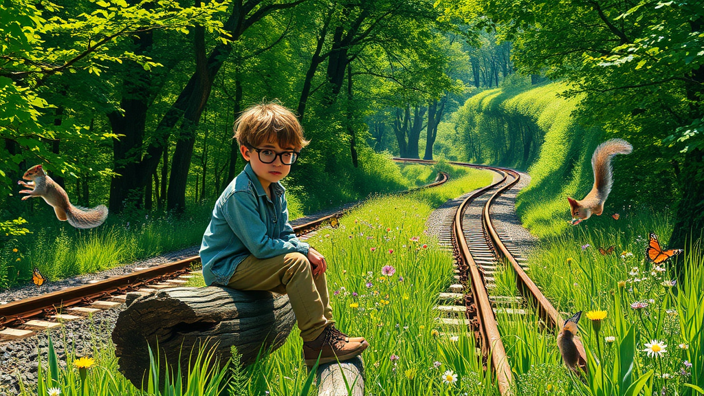 A young boy with tousled hair and oversized glasses sits on a decaying wooden log, his shoulders slumped and a look of melancholy in his eyes. He is perched beside rusty train tracks, winding into the distance and disappearing into a lush, verdant forest. The trees around him are alive with vibrant shades of emerald and jade, their leaves casting dappled patterns of light and shadow on the forest floor. Wildflowers in bright hues of yellow, purple, and pink peek through the tall grass, while butterflies flutter gently in the warm sunshine. Despite the boy’s sadness, the scene is animated with color and life, as if nature itself is trying to lift his spirits with its beauty. Nearby, a squirrel chatters softly, and birds chirp from the branches overhead, adding a lively contrast to the boy's somber mood.
