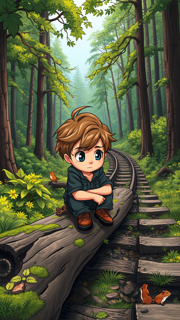 A young boy with tousled hair sits forlornly on a decaying wooden log, his eyes downcast, conveying a sense of melancholy. He is next to an old train track, partially covered in moss, hinting at disuse. Behind him is a lush green forest, brimming with life, where tall trees reach for the sky and vibrant foliage creates a natural tapestry. The cartoon-style artwork is bursting with vivid colors: the deep greens of the forest, the rich browns of the log, and the earthy tones of the track. Small creatures, like chipmunks and birds, add touches of life to the scene, while a gentle breeze ruffles the boy's hair, indicating an underlying hopefulness. The contrast between the boy's sadness and the lively surroundings creates a poignant yet colorful tableau.