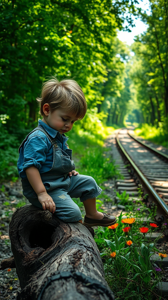 A young boy with tousled hair sits forlornly on a decaying wooden log, his small shoulders slumped and his eyes gazing downwards with a melancholic expression. Beside him, worn train tracks stretch into the distance, their metal glinting softly in the dappled sunlight. Surrounding the scene is a lush green forest, its vibrant foliage bursting with various shades of emerald, with rays of sunlight filtering through the leaves. Brightly colored wildflowers dot the forest floor, adding pops of red, yellow, and purple against the greenery. The boy's attire is simple, with a faded blue shirt and patched-up overalls, subtly highlighting his innocence. A gentle breeze rustles the leaves, adding a sense of movement to the vibrant yet gentle atmosphere. The overall scene captures a poignant mix of sadness and vitality, as if the lively forest is embracing the boy's sorrow with its comforting beauty.