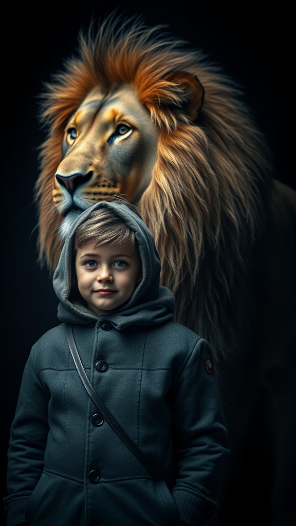 A young boy wrapped in a thick coat and hood stands beside a majestic full-length lion, set against a deep, shadowy backdrop. The scene is illuminated by dramatic, cinematic lighting that highlights the intricate details of the boy's expression and the lion's powerful form. The image is rendered with exceptional clarity and depth of field, capturing the vivid texture of the lion's mane and the contrasting softness of the boy's coat.