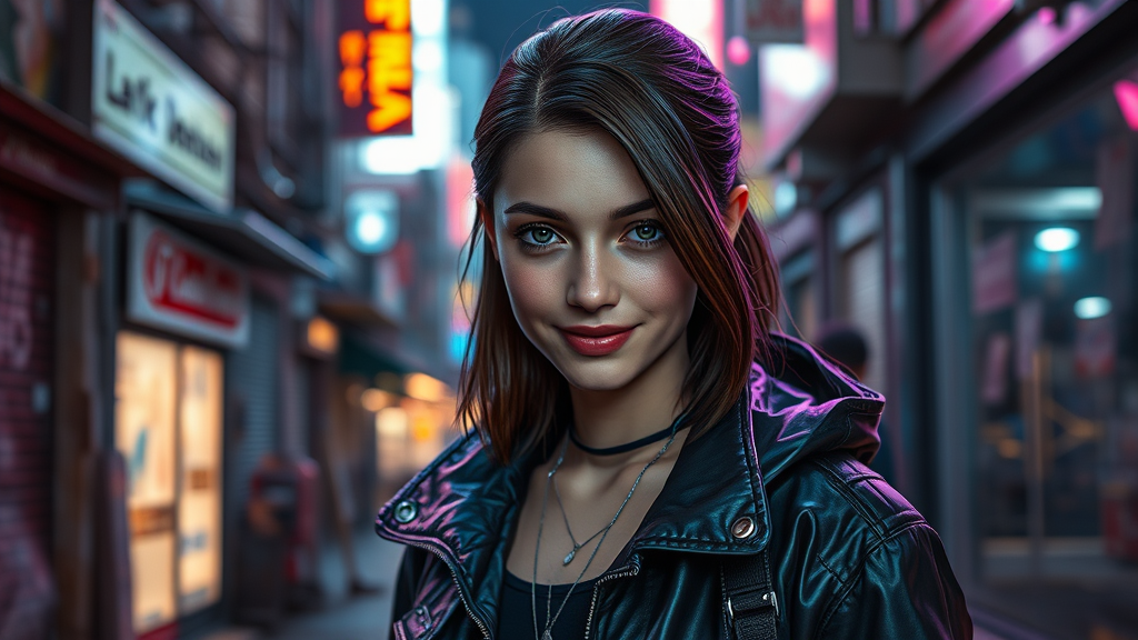 A young, captivating cyborg girl with pastel lighting and a mysterious smile, her bright and piercing eyes capturing attention. She embodies the Deus Ex Mankind Divided style, dressed in a chic, blown jacket reminiscent of fashion magazine aesthetics. The scene unfolds in a slum alley of a bustling night city, her natural glossy hair enhancing her stunning appearance. Shot with a 150mm lens at ISO 100, the photograph maintains a high-quality finish avoiding any jpeg artifacts. Her attire appears slightly worn yet stylish, without broken fabric lines or poorly drawn elements, perfectly blending with the gritty yet vibrant urban backdrop. Despite the surrounding disarray, her presence remains flawless and magnetic.