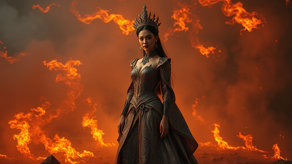 A young, captivating Queen of the fire stands gracefully on the ground amidst a swirling fog of spiraling flames, her presence both majestic and ethereal. She is adorned in elaborate clothing that shimmers with intricate patterns, resembling an elegant fusion of classical regality and futuristic circuit board designs. Her face is perfect and stunningly beautiful, exuding an aura of confidence and mystery. The composition is flawlessly balanced, capturing her in a poised and elegant stance amidst the fiery mist. Rendered with photorealistic concept art precision, the scene is brought to life with intense shadows and dramatic lighting that accentuate her regal demeanor. This masterpiece is realized in ultra-high-definition quality, rendered in 8k resolution with sharp focus, serving as the epitome of a fantasy-inspired, darkly enchanting artistic creation. Perfect as a wallpaper, the image is detailed in high HDR quality, immersing the viewer in a world where fantasy meets cutting-edge artistry.