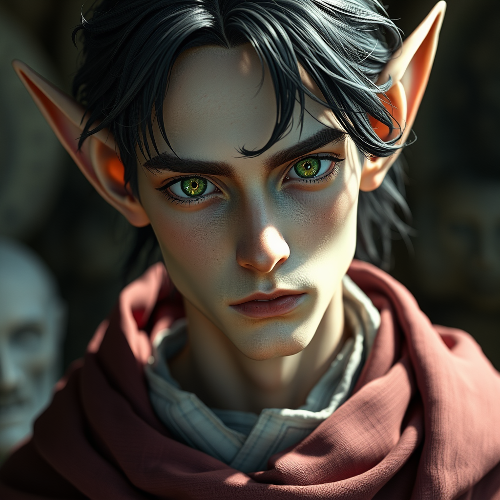 A young Caucasian man with an ethereal appearance, featuring very long elf ears and alabaster skin, complemented by ebony black hair and gold-flecked green eyes. He is a wizard, scribe, and scholar, draped in a beautiful, intricately detailed robe. His captivating gaze reveals intricate eyes, reminiscent of a Pixar animation in 8K high resolution. The scene is illuminated with Rembrandt lighting, akin to a Ghibli Studio masterpiece. The character embodies a cinematic fairy tale essence, captured in vibrant 4K quality.