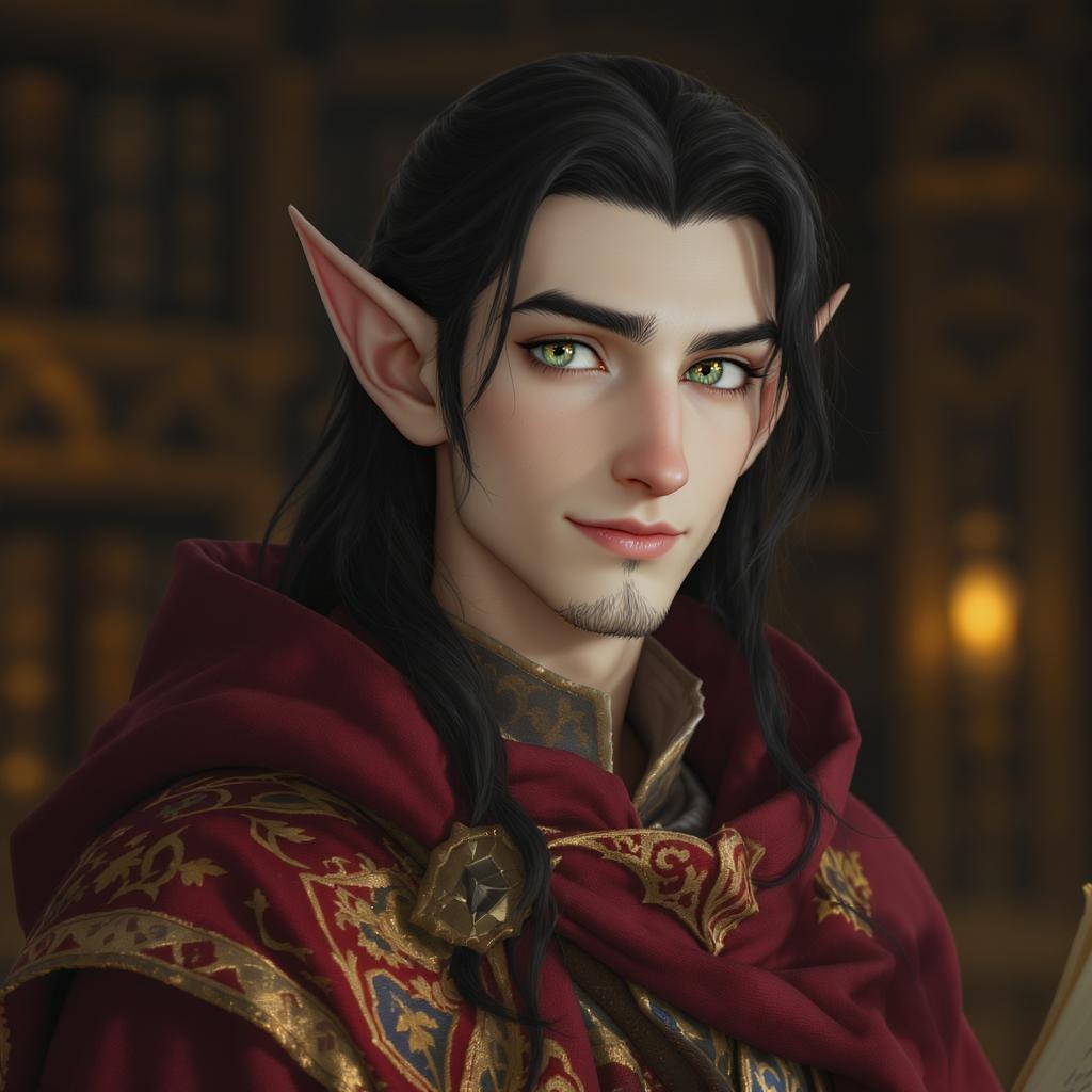 A young Caucasian man with an ethereal aura, resembling an elf of ancient lore, possessing long, elegant elven ears. His alabaster skin contrasts strikingly with flowing ebony black hair. His captivating eyes are a mesmerizing green, flecked with shimmering gold. As a distinguished wizard and learned scribe, he is donned in an exquisitely crafted robe, rich with intricate patterns and vibrant colors. This character is rendered in stunning detail, reminiscent of a Pixar masterpiece, with influences from Ghibli Studio and the timeless essence of a fairy tale. The scene is illuminated with cinematic, Rembrandt-style lighting, capturing every nuance of his scholarly presence in breathtaking 4K resolution.