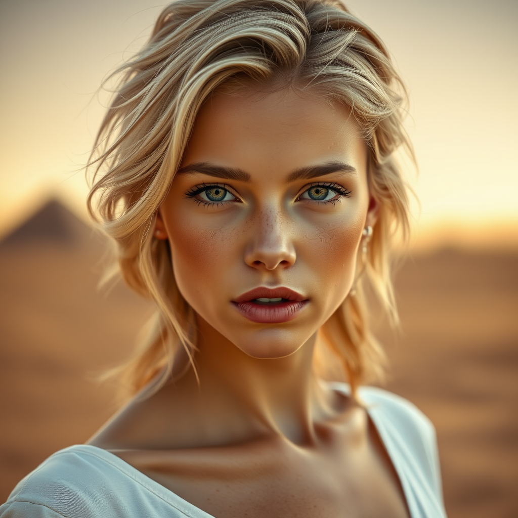 A young Caucasian woman with blonde hair stands in a vast desert landscape, embodying a futuristic vibe. Her presence is captured in a hyperrealistic, cinematic photo with 8k ultra-realistic details. The focus is sharp, emphasizing high detail with a depth of field that draws attention to her expressive features. The scene is illuminated with cinematic lighting that casts dramatic shadows across her visage. The image, influenced by the art styles of Artgerm, Greg Rutkowski, and Alphonse Mucha, presents her as a concept of both oil painting and digital artistry, blending elements of sci-fi with ethereal beauty. The surroundings hint at an Egyptian influence, while maintaining perfect anatomical proportions and natural forms. Her skin has a subtle tan from the sun, adding to the realism and warmth of the scene.