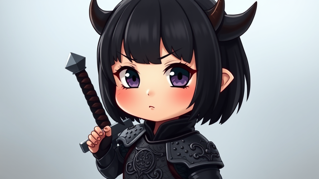 A young chibi girl with a bob cut of black hair, wearing ornate black armor, stands with a sword slung behind her back. She exudes a private, mischievous charm with small devil horns peeking from her head. Her appearance suggests an air of innocence yet bravery. The image, rendered in 8k UHD with HDR quality, captures intricate details and a vibrant display. Her facial expression is slightly cross-eyed, adding a quirky touch, and her hands seem to be whimsically depicted with extra fingers, enhancing her fantastical character. The backdrop maintains focus on her, avoiding distractions such as watermarks or text, while keeping her centered in a crisp, clear frame, ensuring no blurriness or artifacts distort the scene.