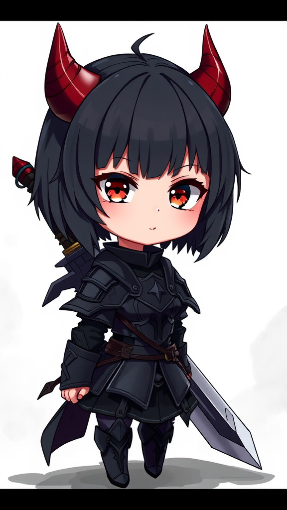 A young chibi girl with short black hair styled in a bob cut, dressed in ornate black armor, gives off an enigmatic presence. Her design features devil horns adding a mischievous charm. She carries a sword, positioned behind her back, symbolizing readiness. Despite her youthful appearance and smaller size, there's a sense of strength emanating from her. The artwork displays high-definition clarity and vibrant details, presented in 8k resolution. Her innocent yet fierce aura is accentuated by her cross-eyed expression and slight quirks, like a long neck and extra fingers that hint at her uniqueness. The scene is polished but avoids elements like watermarks, logos, or textual distractions, ensuring the focus remains solely on this intriguing, otherworldly character.