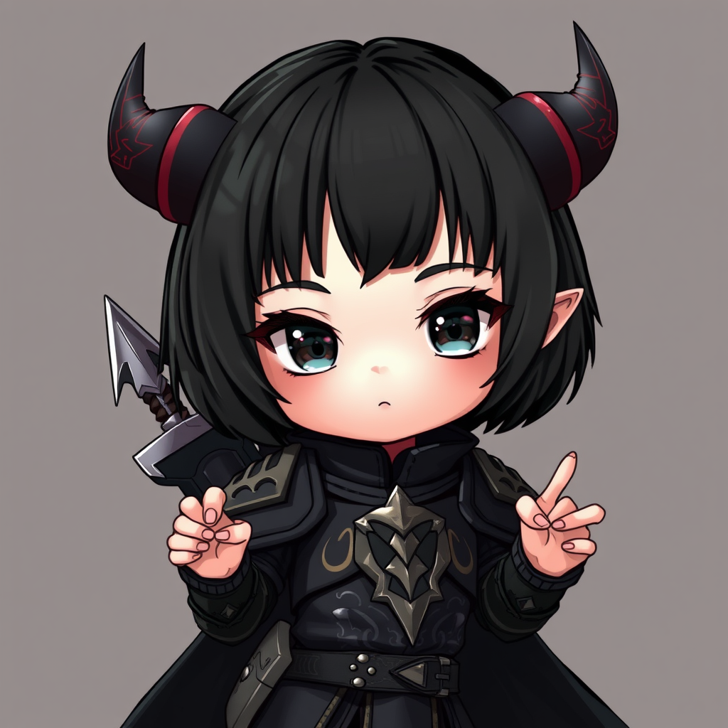 A young chibi girl with striking black hair styled in a bob cut, adorned in intricate black armor, her petite frame exuding a mysterious aura. She carries a sword on her back, a hint of mischief in her devilish horns. This character exudes an otherworldly charm, her eyes shimmering with curiosity. Despite her youthful appearance, she holds an imposing presence, enhanced by her surreal features. Her face, seemingly multiplied, exudes a unique beauty, with extra fingers adding an intriguing twist. This whimsical figure seems to exist in a high-definition realm, but with a touch of the fantastical as she playfully teeters on the edge of the imaginary world.