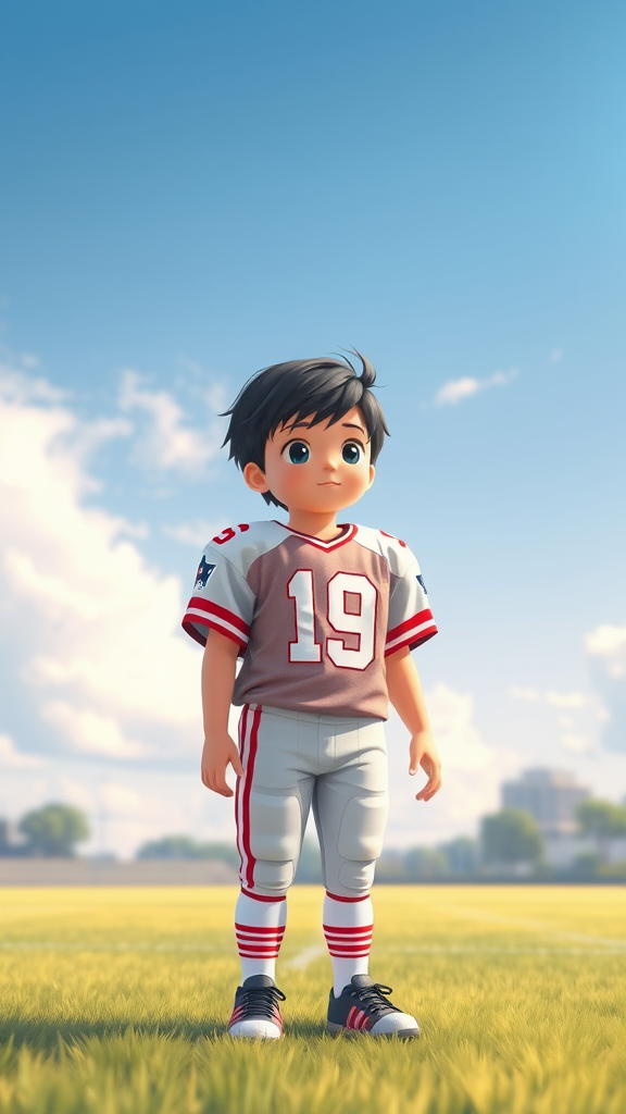 A young child in a classic American football uniform stands on an expansive field under the wide sky. The style is inspired by Yanjun Cheng, mixing digital art with a lofi aesthetic reminiscent of the internet's beloved lofi girl meme. The piece has a contemporary touch, akin to works trending on Dezeen, and emulates a catalog photo feel. Drawing inspiration from the 3D render styles of artists like Beeple combined with the illustrative techniques of Rhads and Lois van Baarle, it takes on a cartoon style. The vibrant artwork features bright pastel colors, capturing the charm of retro anime.
