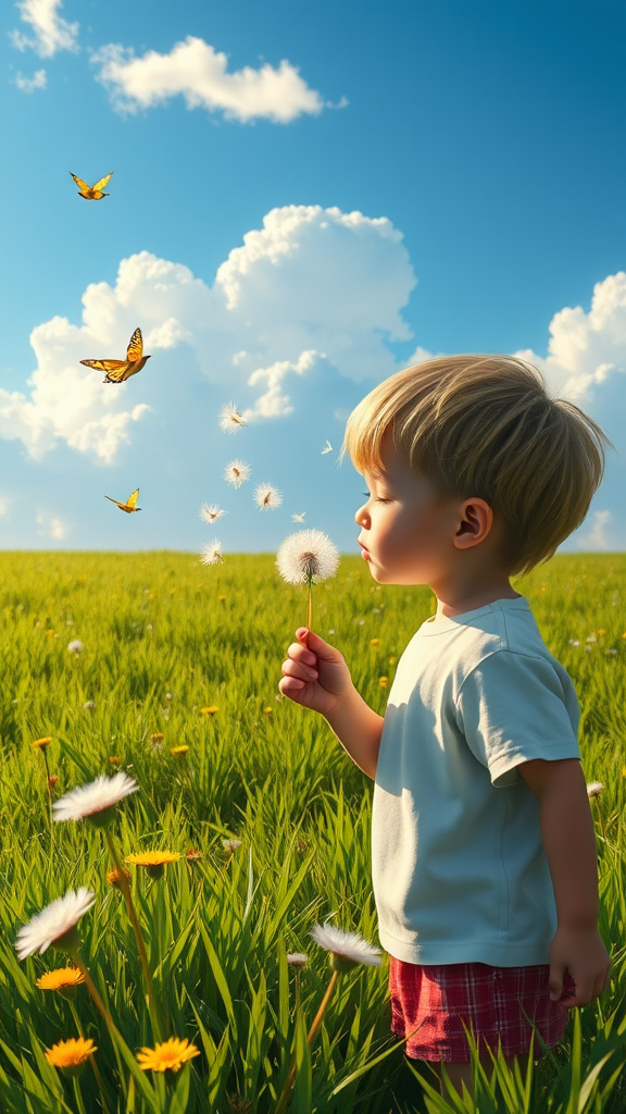 A young child playfully blows the fluffy seeds of a dandelion, each one catching the golden rays of the sun as they gently float through a lush, vibrant meadow. The scene is set under a clear blue sky with soft, billowing clouds casting playful shadows over the landscape. Nearby, butterflies flutter gracefully and birds sing sweet melodies, enhancing the tranquil ambiance. The lighting is cinematic, casting a warm glow over the scene, emphasizing the serene beauty of nature. This photorealistic artwork, reminiscent of Studio Ghibli's enchanting style, captures the innocence and wonder of childhood in a picturesque outdoor setting.