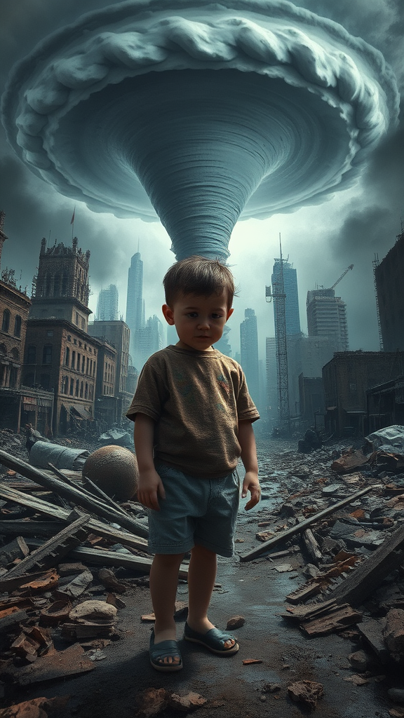 A young child standing alone amidst the ruins, sorrow etched on their face, captured in an oil painting depicting a colossal swirling tornado tearing through a devastated city, ultra-wide shot highlighting the sheer scale of destruction, a powerful natural disaster portrayed in cold, somber colors, featuring an epic composition and grandeur, a masterpiece of emotional depth and visual intensity, award-winning quality, rendered in stunning HD clarity, 64K resolution.