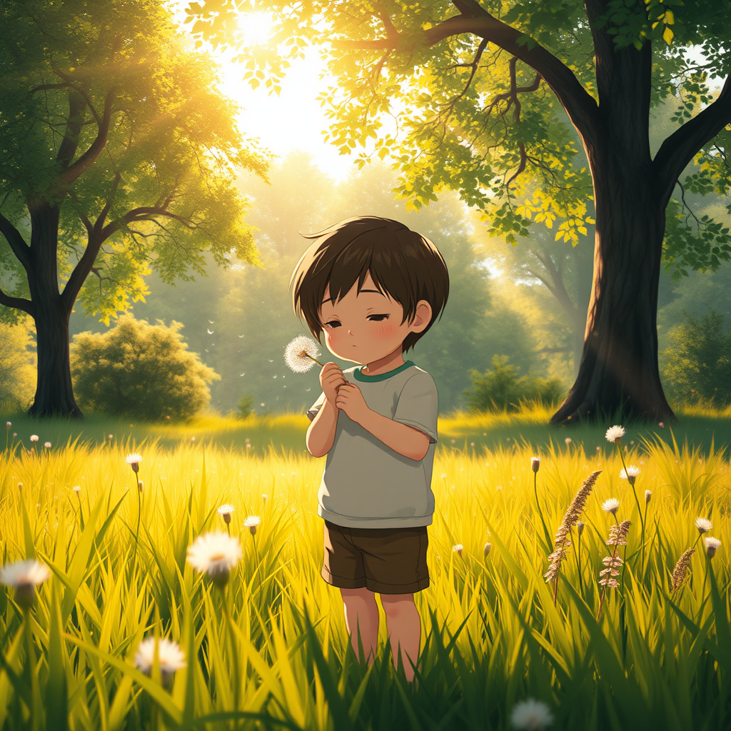 A young child stands in a lush meadow, gently blowing the seeds of a dandelion, surrounded by a vibrant outdoor nature scene. Sunlight filters through the trees, casting a warm, cinematic glow over the scene. The intricate details of the landscape and the child's expression are rendered in photorealistic art style, reminiscent of Studio Ghibli's enchanting visuals. The scene is filled with the gentle rustle of leaves and the soft hum of nature, evoking a sense of wonder and tranquility.