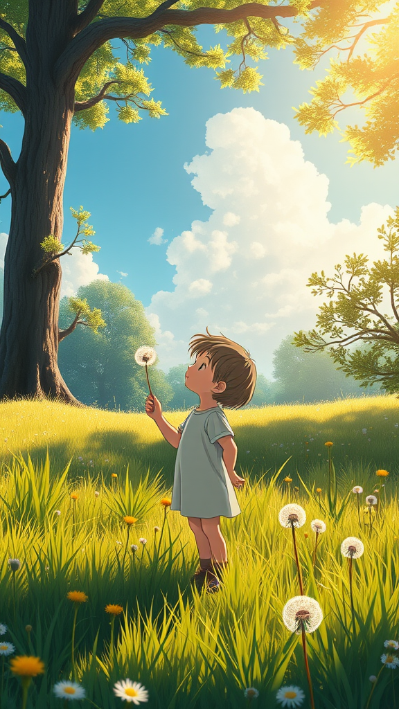 A young child stands in a sun-dappled meadow, gently blowing the delicate seeds of a dandelion into the warm afternoon breeze. The scene is filled with vibrant wildflowers and lush green grass, with towering trees framing the landscape. Soft, golden light filters through the leaves, casting intricate patterns on the ground. The sky is a perfect azure, dotted with fluffy white clouds that drift lazily by. In this serene moment, the world is alive with subtle movement and the promise of adventure. The whimsical and photorealistic art style evokes the enchanting essence of Studio Ghibli, capturing the magic and wonder of childhood amidst the splendor of nature.