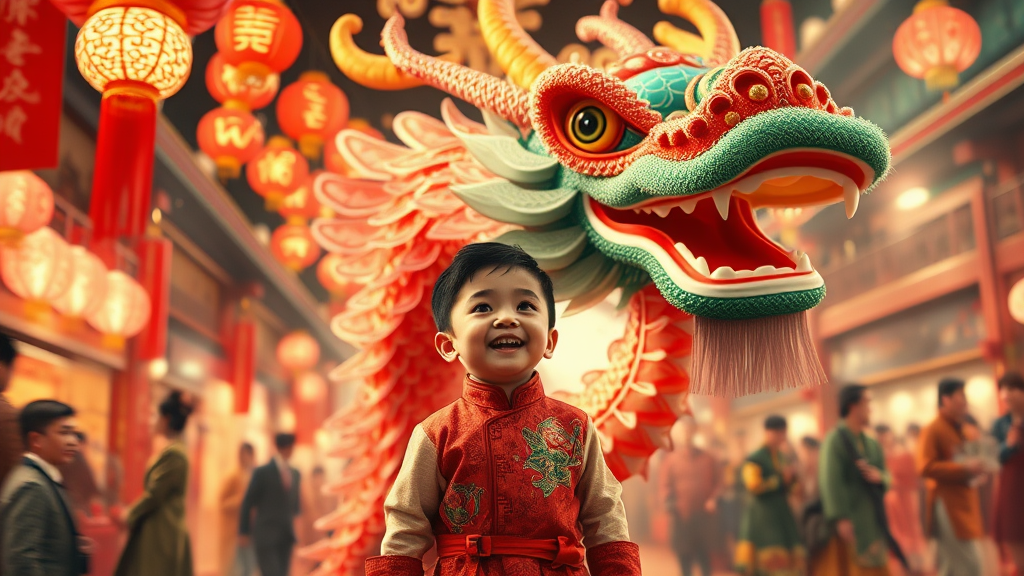 a young chinese boy stands excitedly in front of a vibrant lunar new year dragon, depicted in digital painting style, with elaborate and intricate costumes reminiscent of victorian-inspired illustrations, capturing the essence of joyful chaos. the scene is bathed in soft light red and green hues, with traditional costumes adding depth and cultural richness. the background features a lively celebration environment, adding to the overall festive atmosphere.