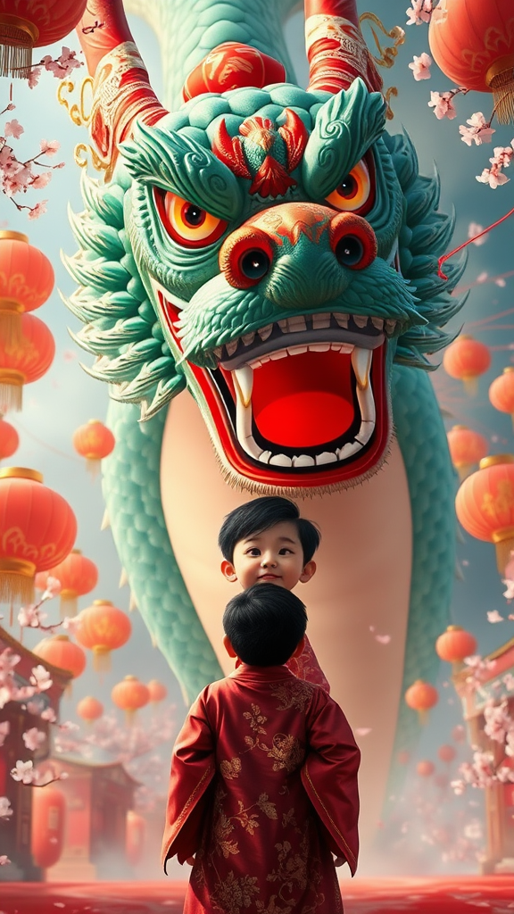 A young Chinese boy stands in awe before a grand Lunar New Year dragon, its scales shimmering in light red and green hues. The scene is depicted in a digital painting style, with intricate costumes blending traditional Chinese elements and Victorian-inspired details. The dragon's eyes gleam with a mischievous spark, surrounded by joyful chaos as vibrant lanterns and delicate cherry blossoms swirl in the background. The boy is dressed in a richly embroidered robe, with golden threads weaving through deep crimson fabric, reflecting the festive spirit. The air is filled with excitement, capturing the harmonious blend of tradition and celebration.