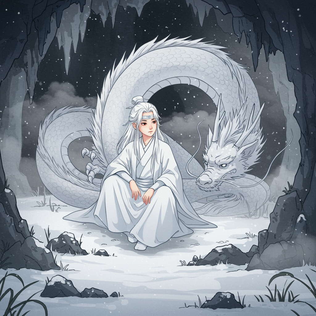 A young Chinese boy with ethereal white hair resides in a mystical cave, embodying the aura of a celestial being. He dons a pristine white Daofu, and a delicate headband crowns his head. By his side, a majestic Chinese dragon coils gracefully, both figures harmonizing with the serene beauty of their surroundings. The scene is rendered in the timeless elegance of Japanese Ukiyo-e, capturing a Chinese fairy tale's enchanting landscape. Mist swirls gently amidst a blanket of white snow covering the ground, creating an atmosphere of otherworldly tranquility. The boy and dragon exude an otherworldly grace, blending seamlessly with the mist-shrouded scenery that whispers of ancient legends and hidden wonders.