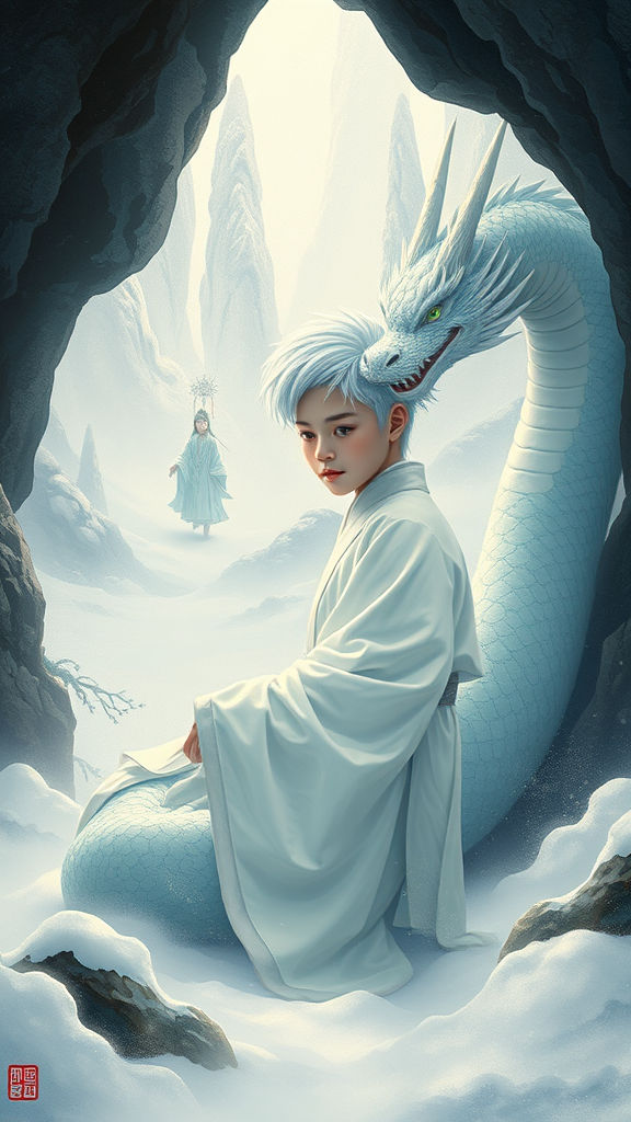 A young Chinese boy with snow-white hair resides in a mystical cave, cloaked in an elegant white Daofu and adorned with a delicate headband. Beside him coils a majestic Chinese dragon, their presence exuding an ethereal aura. The scene, depicted in the exquisite style of Japanese Ukiyo-e, unfolds against the backdrop of a breathtaking Chinese fairy tale landscape. A gentle mist envelops the surroundings, with a pristine blanket of white snow draping the earth below. Graceful figures traverse this enchanting world, their movements harmoniously blending with the serene and otherworldly atmosphere.