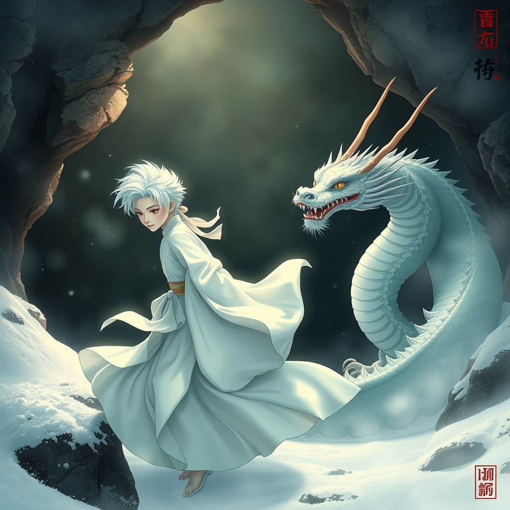 A young Chinese boy with striking white hair resides in a mystical cave, embodying the essence of a celestial being. He dons a flowing white Daofu, tied with an elegant headband. By his side, a majestic Chinese dragon coils gracefully. The scene is depicted in the style of Japanese Ukiyo-e, set against the enchanting backdrop of a Chinese fairy tale. The air is misty, and a gentle blanket of white snow covers the ground, creating a tranquil and ethereal atmosphere. The figures move with unparalleled grace amidst this captivating landscape, where natural beauty and mythical elements intertwine seamlessly.