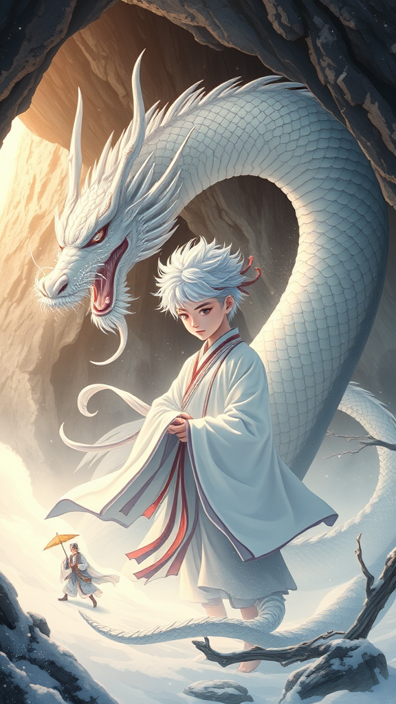 A young Chinese boy with striking white hair resides in a mystical cave, embodying the essence of a celestial being. Adorned in a flowing white Daofu and a delicate headband, he exudes an ethereal presence. Accompanied by a majestic Chinese dragon that sinuously winds around him, their bond symbolizes ancient wisdom and power. The scene unfolds in the style of Japanese Ukiyo-e, revealing the enchanting beauty of a Chinese fairy tale. The landscape is shrouded in a gentle mist, with white snow blanketing the ground, adding a serene and otherworldly ambiance. Graceful figures move elegantly through this dreamlike setting, their movements as fluid and harmonious as the dance of the dragon, creating a composition that captures the timeless allure and mysticism of ancient lore.