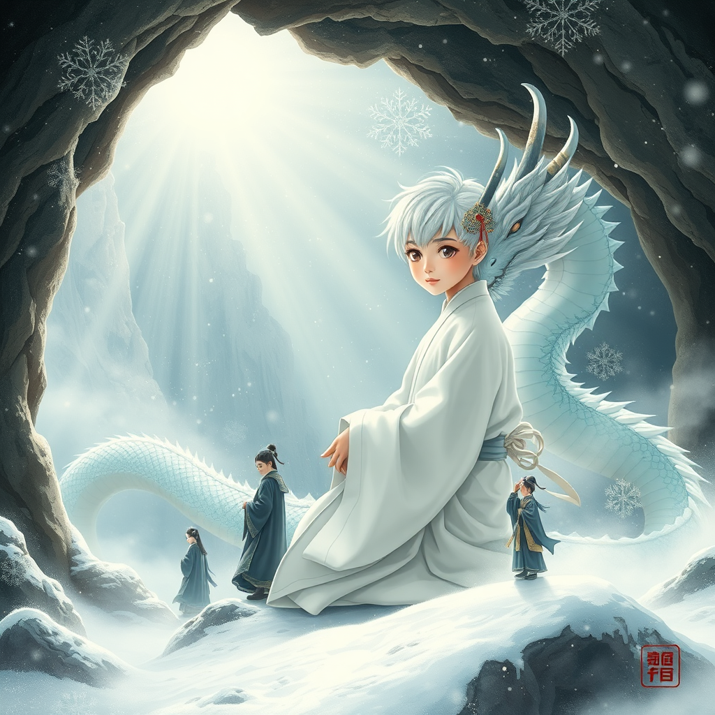 A young Chinese boy with striking white hair resides in an ancient cave, accompanied by a celestial aura. He is clad in a flowing white Daofu, accented by an elegantly tied headband. By his side is a majestic Chinese dragon, its scales shimmering in the ethereal light. The scene unfolds in the style of a Japanese Ukiyo-e, capturing the beauty of a Chinese fairy tale with breathtaking precision. The landscape is enveloped in a serene mist, with delicate snowflakes blanketing the ground, creating a tranquil, snowy ambiance. Graceful figures move through the tableau, enhancing the mystical charm of this enchanted setting.