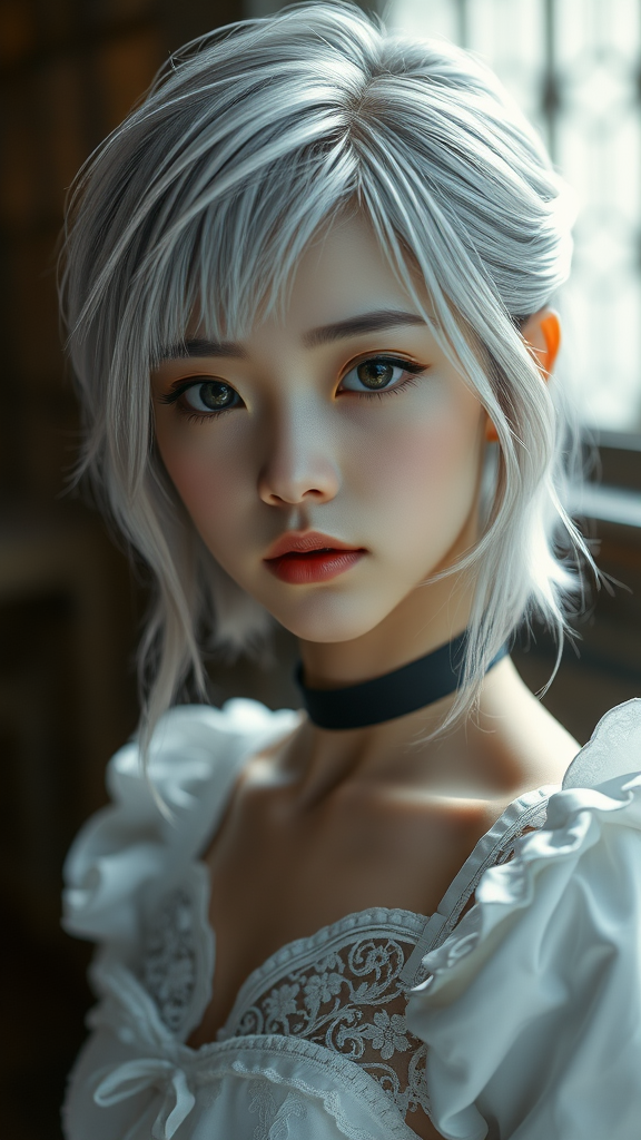 A young Chinese girl with medium-length silvery hair, her delicate features reminiscent of the intricate designs by Greg Rutkowski and Magali Villeneuve. She dons a white maid outfit with elegant lace details paired with a sleek black choker. Her captivating eyes and petite but athletic figure are highlighted under cinematic lighting, adding an element of surrealism to the scene. The image is rendered in stunning 8k ultra-high definition, capturing every nuance and fine detail.