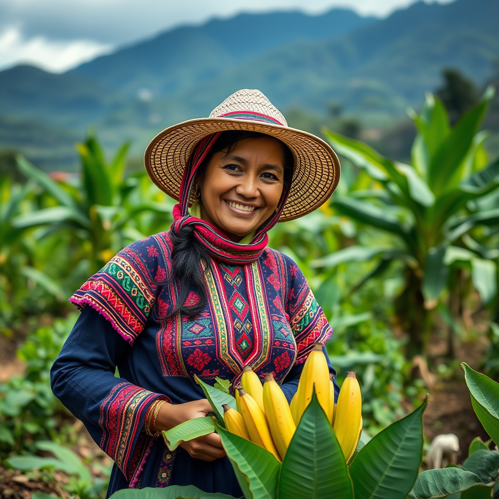 A young Colombian farmer cultivates coffee and bananas, dressed in traditional Colombian farming attire, with vibrant colors and intricate patterns highlighting her connection to the land and her heritage. She stands amidst lush green fields with the Andes in the background, embodying the spirit of resilience and sustainability.