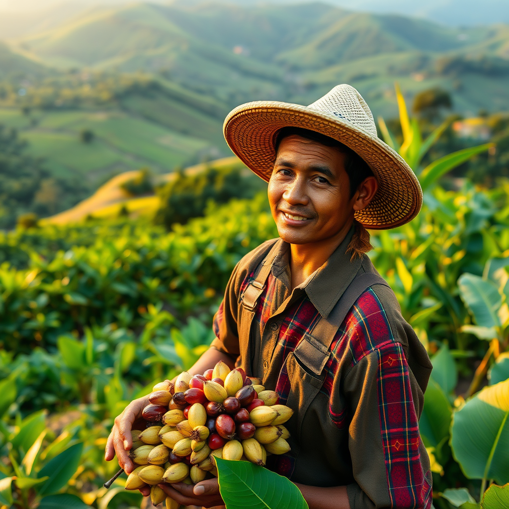 A young Colombian farmer cultivating coffee and bananas, dressed in traditional Colombian farming attire, surrounded by lush green landscapes and vibrant coffee plants, with the golden light of dawn casting a warm glow over the fields, capturing the essence of rural life and agricultural tradition in Colombia.
