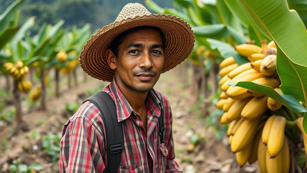 A young Colombian farmer cultivating coffee and bananas, dressed in traditional Colombian agricultural attire.