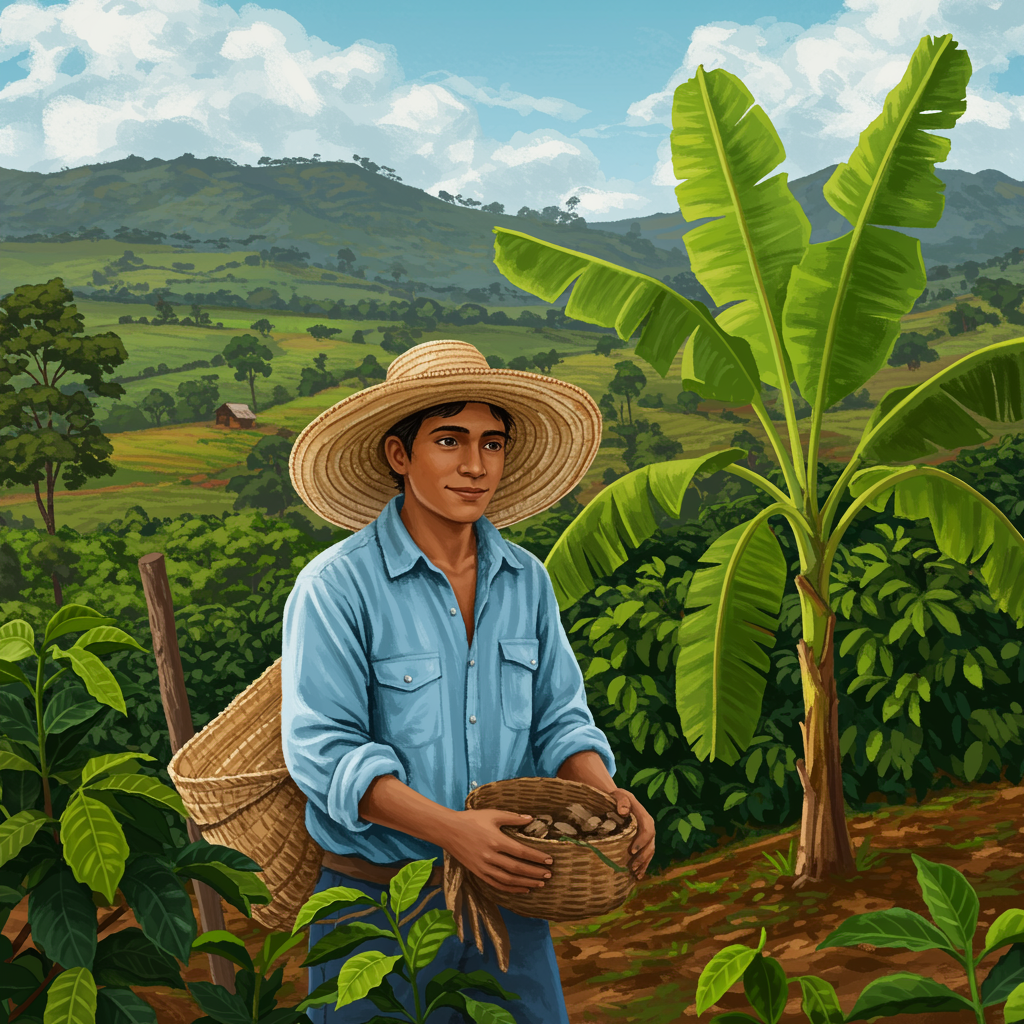 A young Colombian farmer cultivating coffee and bananas, adorned in traditional Colombian farming attire, set against a vibrant landscape of lush green plantations and distant mountains, embodying the essence of rural life and the rich agricultural heritage of Colombia.