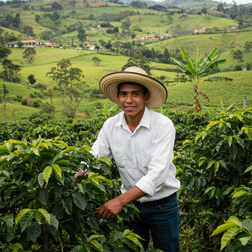 A young Colombian farmer cultivating coffee and bananas, dressed in traditional attire typical of Colombian agricultural workers, set against a backdrop of lush green fields and vibrant plantations.