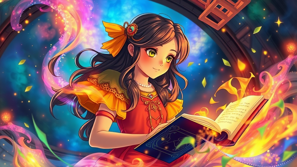 A young enchantress weaving magical wonders, reminiscent of a Studio Ghibli fantasy, surrounded by vibrant colors and ethereal light, her spellbook floating beside her, whispering ancient incantations.