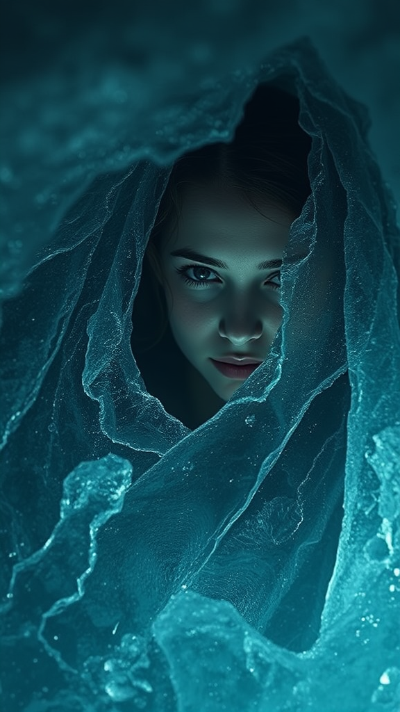 A young, ethereal woman ensnared beneath a crystalline sheet of ice on a frozen lake, her expression a blend of mystery and sorrow; the scene bathed in an eerie, dreamlike glow, shrouded in shadows and illuminated by dramatic lighting that casts intricate patterns across the surface; the atmosphere is dark and surreal, with a cinematic quality evoking an enigmatic story, capturing the moment in exquisite 8k detail against a vertical 9:16 aspect ratio backdrop.