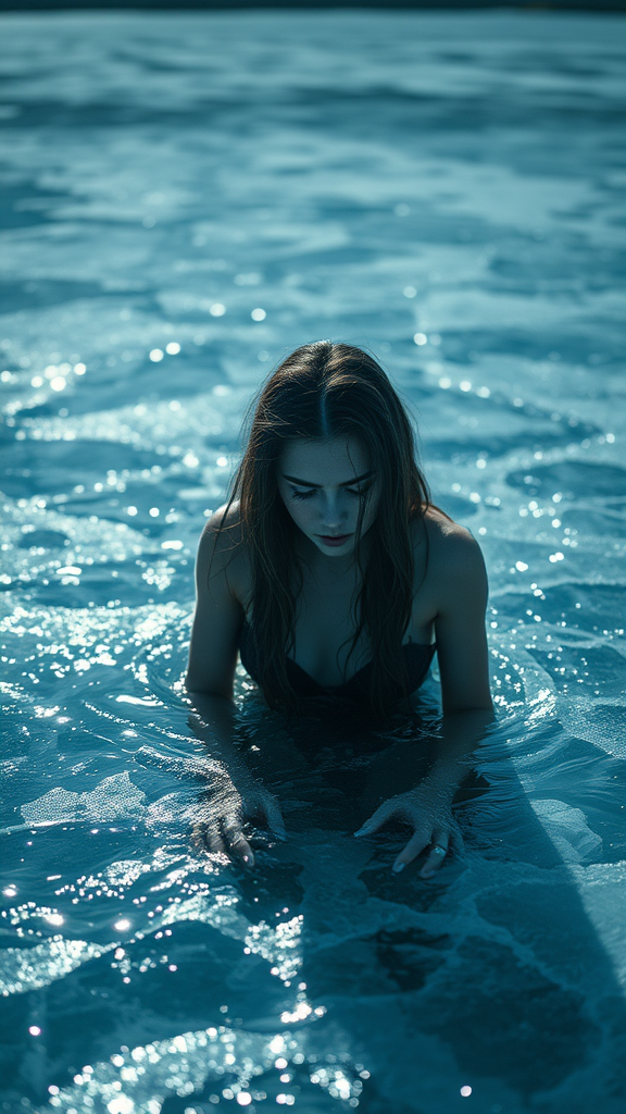 A young, ethereal woman ensnared beneath the surface of a shimmering, frozen lake, surrounded by an aura of enigma and darkness. The scene unfolds in a surreal, dreamlike landscape, bathed in dramatic, cinematic lighting that casts intricate shadows across the ice. The atmosphere is tense, with elements of mystery woven throughout, as the crystal-clear waters reflect the haunting beauty of her plight. Photographed in ultra-high definition, capturing every detail in stunning clarity, the composition is both captivating and haunting.
