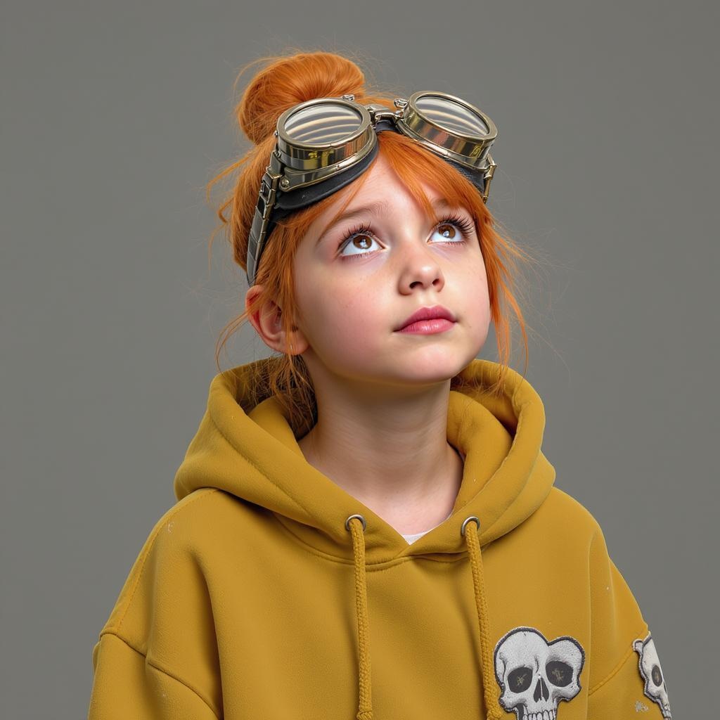 A young, fair-skinned girl, around 13-15 years old, with lively, flaming orange hair tied into a loosely styled messy bun, adorned with large, steampunk-inspired goggles featuring weathered, metallic accents. Her eyes are contemplative and gaze upward thoughtfully. She wears a mustard yellow, oversized hoodie with a worn, DIY appearance, showcasing patches with skull motifs that contribute to its rugged aesthetic.