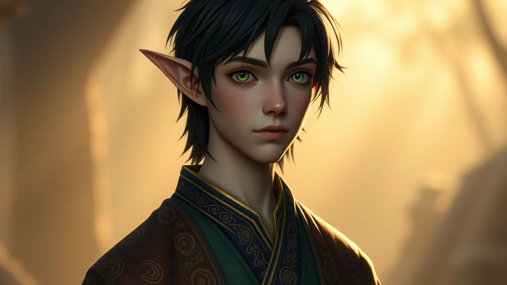 A young, fair-skinned man with an ethereal presence stands before you, his alabaster skin glowing under gentle, cinematic lighting. His elongated, intricately shaped ears denote his elven heritage, while his ebony black hair cascades down like a waterfall at midnight. His gold-flecked green eyes sparkle with wisdom and curiosity, reminiscent of a deep forest pool catching the first light of dawn. Draped in a beautifully ornate robe that flutters with the faintest breeze, he embodies the elegance and mystique of both wizard and scribe. His robes, detailed with ancient symbols and delicate embroidery, whisper tales of the forgotten past. The setting feels like an enchanting blend of a Pixar fairy tale and the timeless brushstrokes of a Ghibli studio creation, enhanced by the refined chiaroscuro of Rembrandt-esque lighting. The scene, captured in stunning 8k, immerses you in a world where magic, scholarship, and the ethereal dance gracefully together, crafting a mesmerizing fairy tale character in 4K resolution.