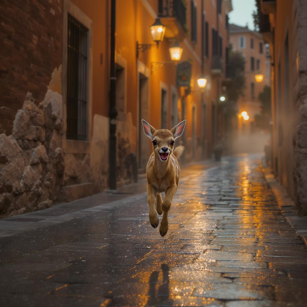 A young fawn bounding joyously through the enchanting streets of Rome, its innocent laughter echoing softly against the cobblestones under the glow of dim, warm streetlights; a cinematic scene unfolds in hyper-realistic, detailed 4k quality, capturing the enchanting contrast of ancient architecture and lively spirit in a picturesque 72:95 aspect ratio.