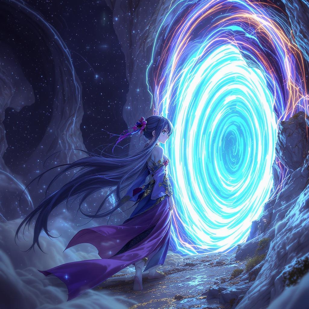 A young female anime character is depicted in a detailed side view, as she stands at the brink of a luminous, swirling portal that connects her vibrant animated world to the realistic realm beyond. Her eyes, wide with curiosity and wonder, reflect the portal's ethereal glow. Her long, flowing hair and intricately designed outfit appear almost lifelike, capturing the manga style essence with photorealistic detail. The portal itself is a mesmerizing blend of colors and energy, casting an enchanting light on her determined expression. The scene balances the fantastical with the real, presenting an 8k high-resolution image that blends two worlds seamlessly.