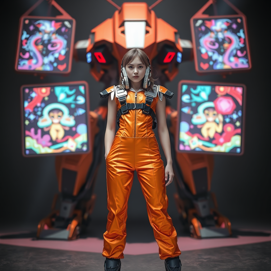 A young female DJ dressed in a radiant metallic orange harness jumpsuit with mirrored shoulder plates and accents, stands confidently in front of a futuristic mech, its looming form casting a silhouetted shadow on the ground. Crisscrossed climate screens behind her display vibrant, dynamic visuals, with animated anime-inspired patterns and graphics. She wears a sparkling headset, its earpieces glowing softly.