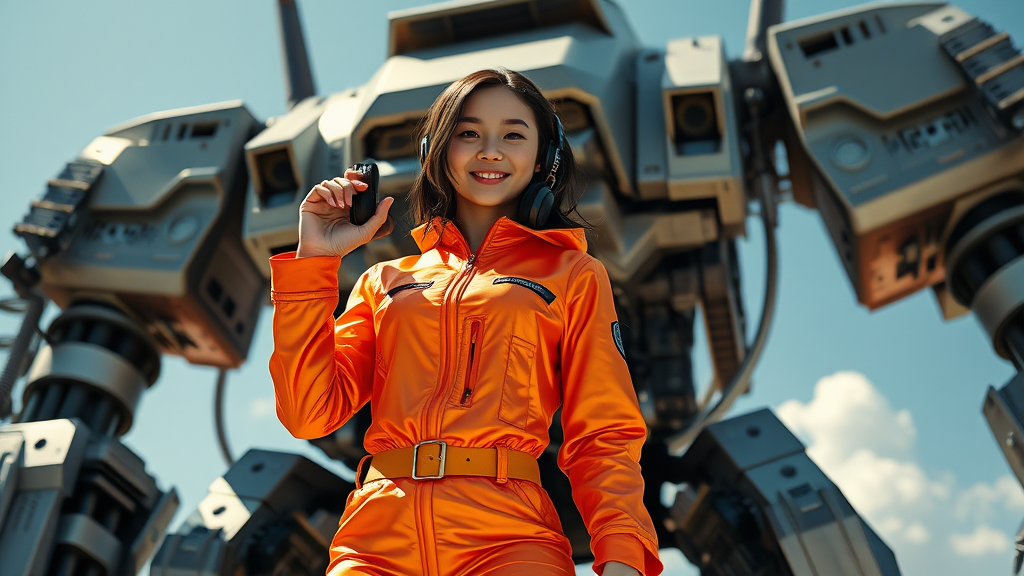 A young female DJ in a dazzling, futuristic orange jumpsuit stands confidently, holding her headphones with a playful smile. The intricate design of her outfit reflects the vibrant, high-energy world of music she inhabits. Behind her looms a majestic old Mech, its metallic form catching the sunlight on a clear, sunny day. The scene bursts with the essence of anime and manga, using bright colors and intricate details akin to offset printing techniques to create a vivid, high-definition poster. The atmosphere resonates with the rhythm of sound waves, visually captured in the background, enhancing the cinematic quality of the image. The overall mood is joyous, with natural lighting highlighting the rich CMYK colors, creating a breathtaking scene in 8K resolution.
