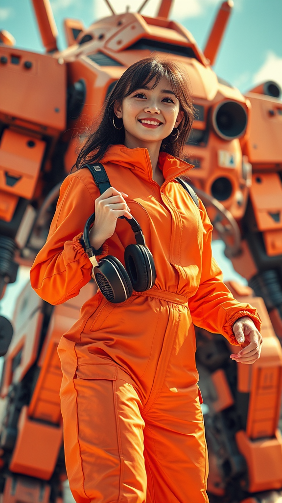 A young female DJ stands confidently in an elaborate, futuristic orange jumpsuit, her headphones poised in her hand. The scene captures her essence like a cinematic movie poster, with vibrant manga-style graphics enhancing the atmosphere. In the background, an ancient Mech looms, washed in the glow of sunny weather. The bright colors pop with the precision of offset printing, bringing the scene to life in exquisite high detail. The composition is in 8K HD and CMYK, exuding a feeling of happiness and featuring natural lighting. Despite the futuristic setting, the DJ’s joyous expression adds a human touch, seamlessly blending the world of music and machines in an eye-catching visual narrative.