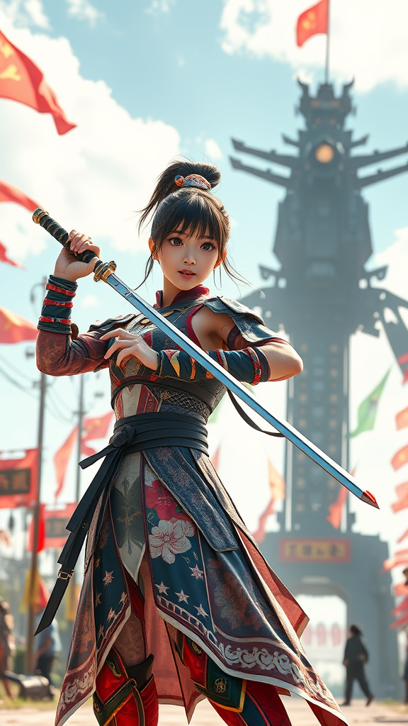 A young female in detailed futuristic samurai attire wields a saber, styled as a cinematic movie poster. She stands confidently against a backdrop of fluttering flags and a towering ancient mech. The scene is vibrant, bathed in sunny, natural lighting, embodying anime and manga aesthetics with bright, bold colors. The image is rendered in high detail, evoking the rich texture of offset printing, with a focus on an 8K HD resolution. The atmosphere is joyful, capturing a moment of harmonious strength in a vividly imagined future, set within a dynamic portrait orientation.